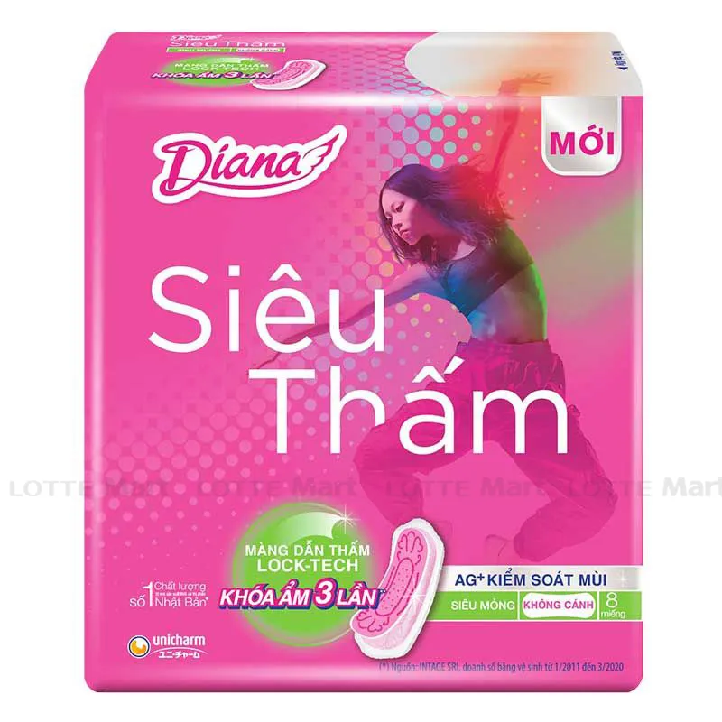 Băng Vệ Sinh Diana Siêu Thấm Siêu Mỏng Không Cánh 8 Miếng sở hữu thiết kế màng dẫn thấm Lock Tech – Khóa ẩm 3 lần: Giúp khóa chất lỏng sâu bên trong, chống thấm ngược gấp 3 lần, cho bề mặt khô thoáng ngay lập tức và ngăn tràn tối ưu.