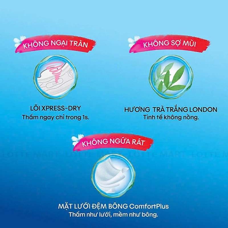 - Băng vệ sinh với miệng quạt mở rộng gấp 1.5 lần chống thấm vượt trội và siêu khô thoáng đem tới sự thoải mái tuyệt đối.