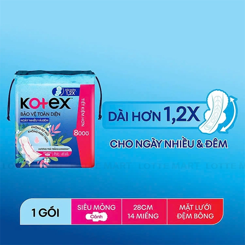 Băng Vệ Sinh Kotex Bảo Vệ Toàn Diện Siêu Mỏng Cánh 28cm được cải tiến với hệ thống bảo vệ chống tràn toàn diện cùng mặt lưới đệm bông ConfortPlus, kết hợp cùng hương trà trắng London dịu nhẹ. Sản phẩm với phiên bản 28cm với độ dài hơn 1.2 lần so với phiên bản 23cm, giúp bạn tự tin vận động trong những ngày nhiều và đêm mà không lo tràn băng.