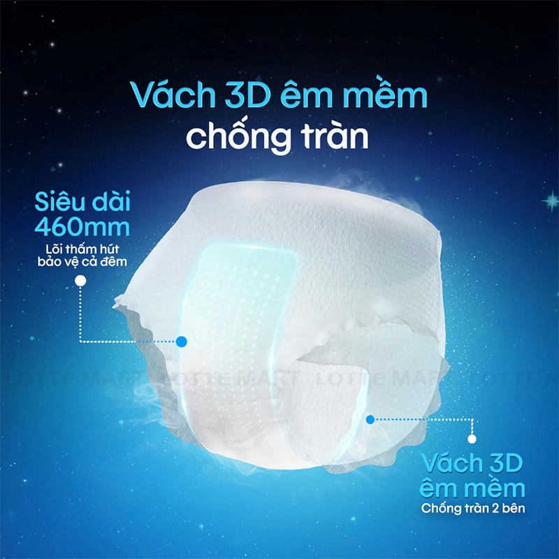 Băng Vệ Sinh Dạng Quần Kotex Cool Size M-L có dạng quần với vách 3D êm mềm, siêu dài 460mm cùng lõi thấm hút vượt trội, giúp chống tràn hiệu quả ở cả phần trước, sau và hai bên, bảo vệ bạn suốt đêm dài.
