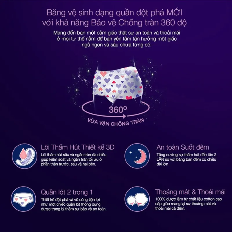 Lõi thấm hút 3D ngăn tràn đa chiều, giúp kiểm soát chất lỏng tối ưu, đặc biệt ở phần thân trước, sau và hai bên. An toàn suốt đêm nhờ tăng cường sự thấm hút đến 2 lần so với băng ban đêm có chiều dài lớn.