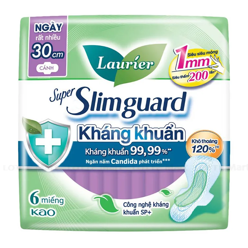 Băng Vệ Sinh Laurier Super Slimguard Kháng Khuẩn Siêu Mỏng Cánh 1mm với công nghệ SP+ Nhật Bản kháng Khuẩn 99,99%, bảo vệ vùng nhạy cảm. Ngăn nấm Candida phát triển.