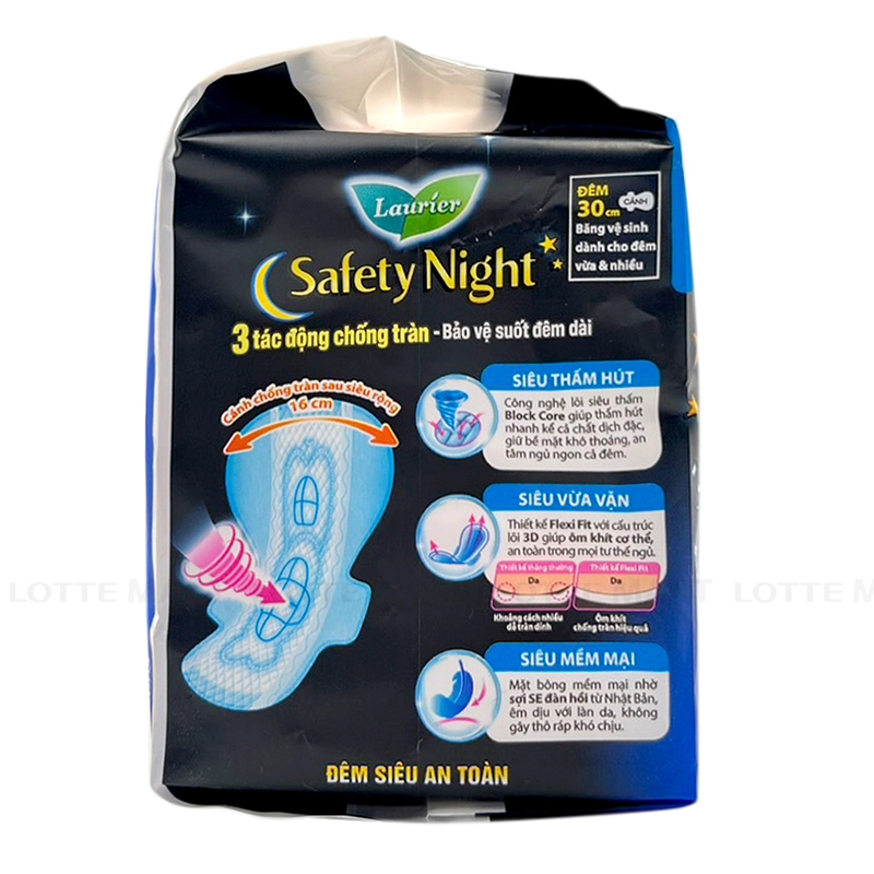Băng Vệ Sinh Ban Đêm Laurier Siêu Chống Tràn 30cm Gói 8 Miếng sử dụng công nghệ lõi siêu thấm nhanh Block Core Nhật Bản thấm hút nhanh kể cả chất dịch đặc và nhiều hơn 1,4 lần (so với loại dày cánh ban ngày). Bề mặt luôn khô thoáng cùng vách chống tràn siêu an toàn cho bạn trọn giấc ngủ ngon không lo lắng.