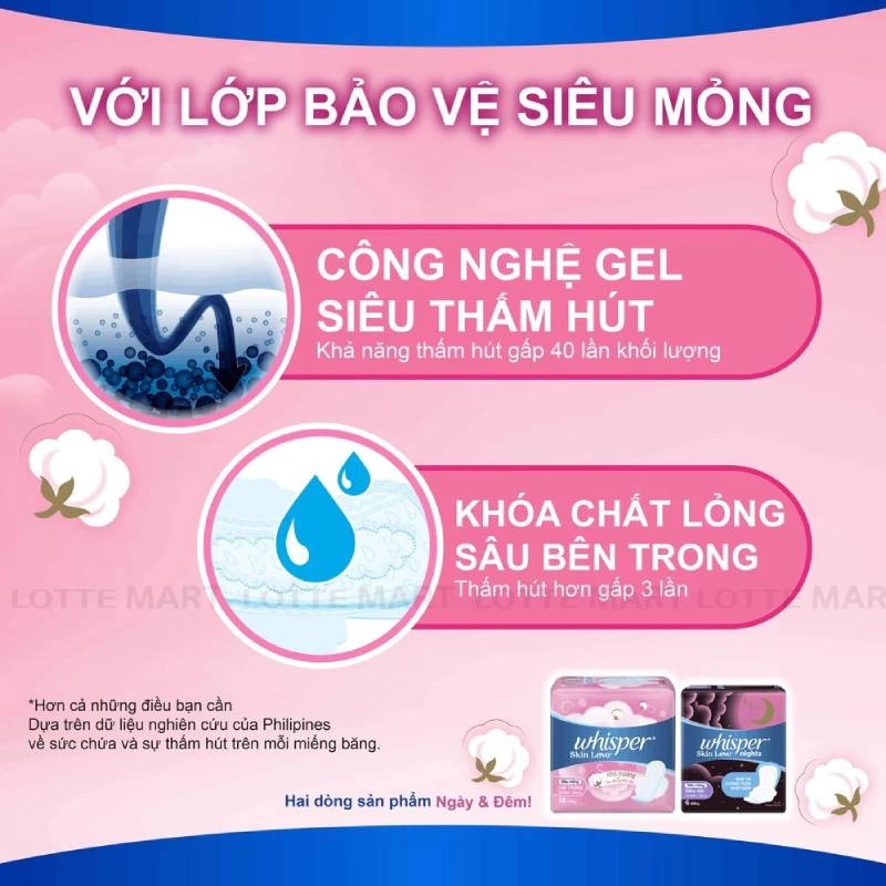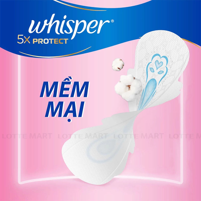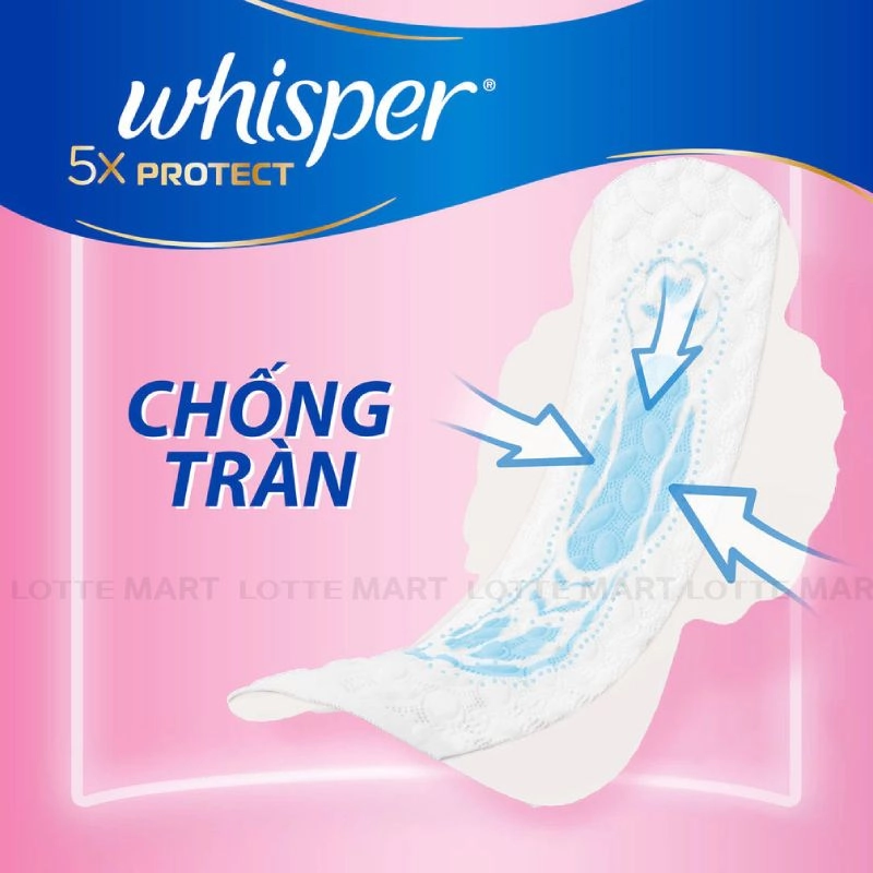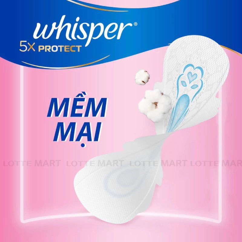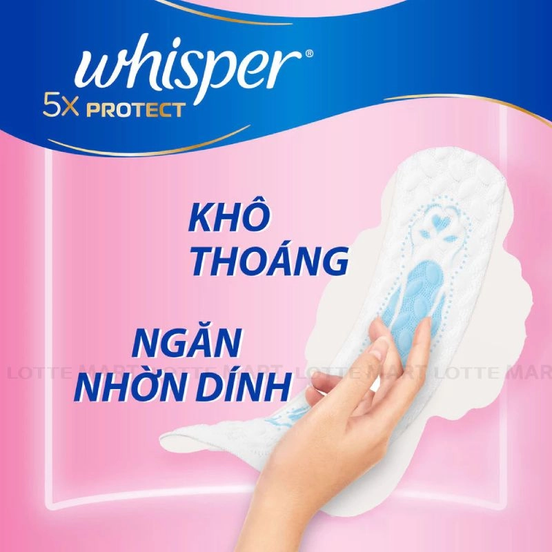 Băng Vệ Sinh Whisper 5X Siêu Mỏng Có Cánh với công nghệ gel siêu thấm hút và chống tràn cùng lớp lõi linh hoạt, mang lại cảm giác an tâm với sự bảo vệ êm ái, thoáng mát.