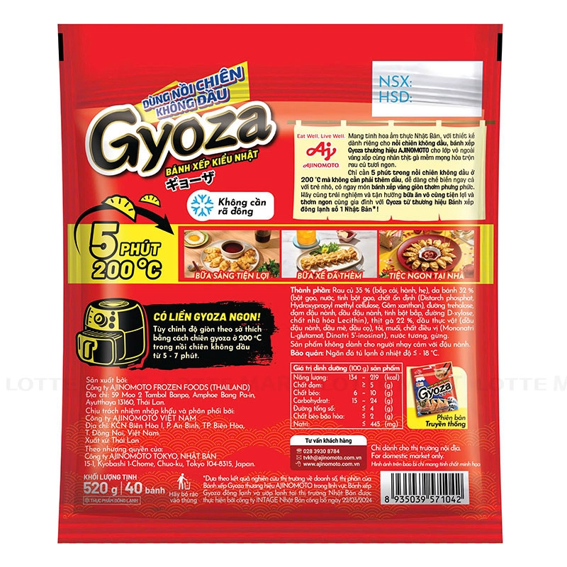 - Mang đậm tinh hoa ẩm thực Nhật Bản, Bánh Xếp Kiểu Nhật Gyoza Ajinomoto Nhân Thịt Gà Và Rau được thiết kế dành cho nồi chiên không dầu, giúp bạn dễ dàng thưởng thức món ngon chuẩn vị chỉ sau 5 phút chế biến.