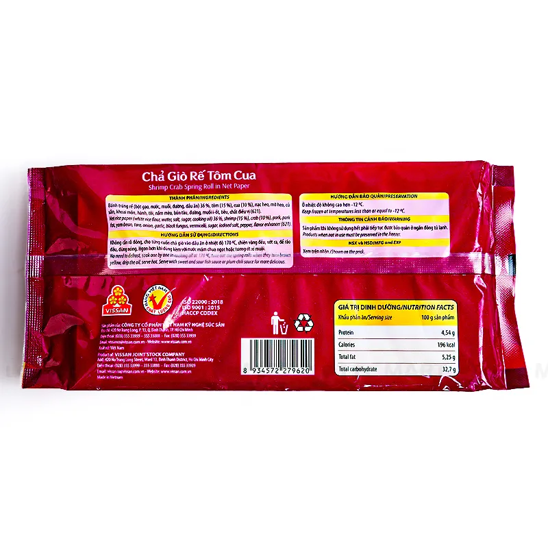 Chả giò rế tôm cua Vissan được đóng gói tiện dụng cho bạn sử dụng cũng như bảo quản, vỏ đựng sản phẩm làm từ nguyên liệu sạch, không lẫn tạp chất hóa học độc hại.