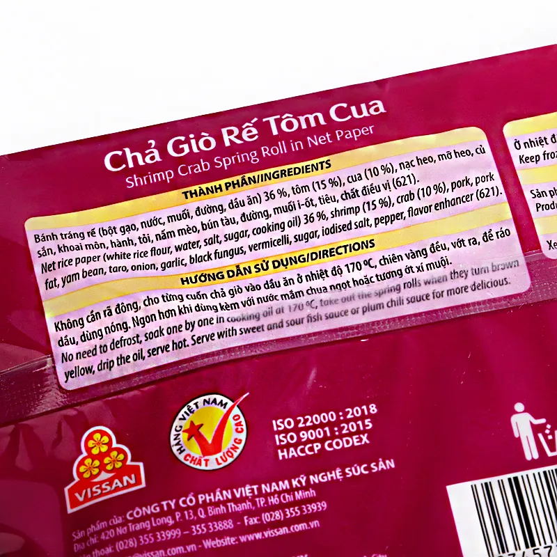 Thành phần: Bánh rế (bột gạo, nước) 25%, thịt heo, tôm (20%), cua (15%), tôm khô, môn, sắn, hành, tỏi, nấm mèo, bún tàu, đường, muối, tiêu, chất điều vị (621). Bảo quản ở nhiệt độ -18 độ C hoặc ngăn đá tủ lạnh.