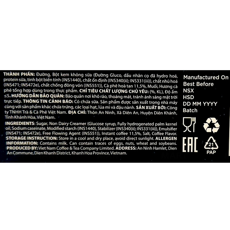 - Đường, bột kem không sữa (đường Gluco, dầu nhân cọ đã hydro hóa, protein sữa, tinh bột biến tính (INS 1440), chất ổn định (INS 340(ii), chất nhũ hóa (INS 471), INS 472e), chất chống đông vón (INS 551)), cà phê hòa tan 11.5%, muối, hương cà phê tổng hợp dùng trong thực phẩm.