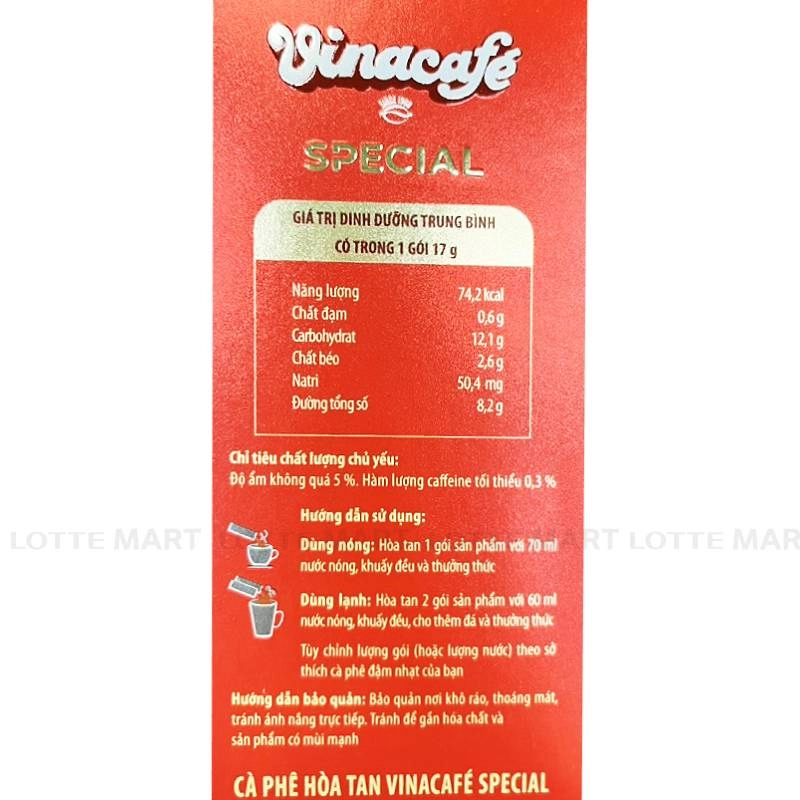 - Cà Phê Hòa Tan Vinacafe Special 3 Trong 1 mang đến cho bạn một trải nghiệm cà phê tuyệt vời ngay tại nhà. Với thành phần được chọn lọc kỹ càng, sản phẩm kết hợp bột kem thực vật, đường và cà phê hòa tan, tạo nên hương cà phê lôi cuốn, vị cà phê đậm đà với hậu vị thanh nhẹ.