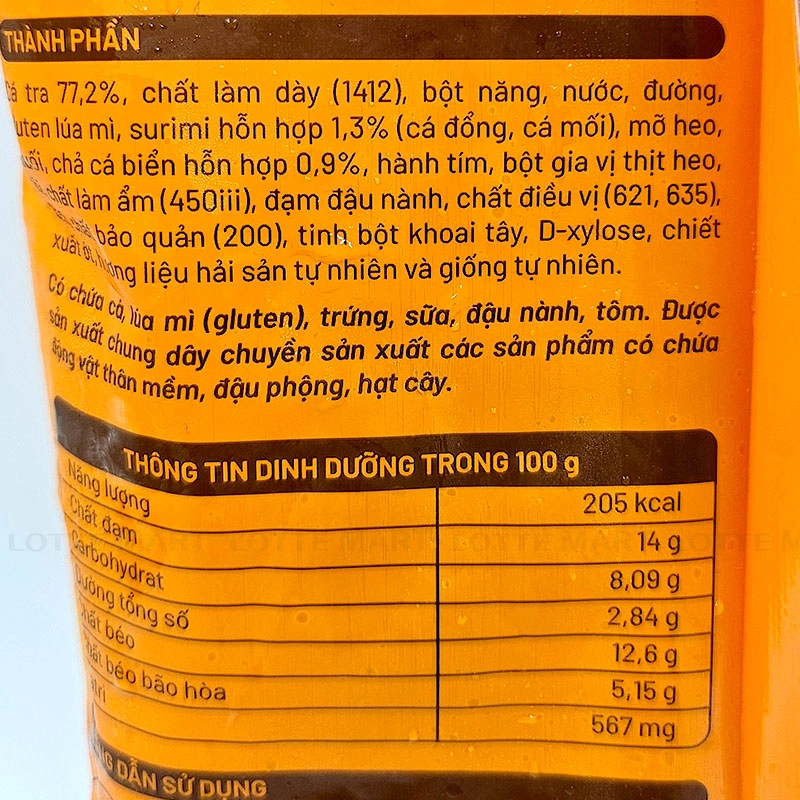 - Cá tra 77.2%, chất làm dày (1412), bột năng, nước, đường, gluten lúa mì, surimi hỗn hợp 1.3% (cá đồng, cá mối), mỡ heo, chả cá biển hỗn hợp 0.9%, hành tím, bột gia vị thịt heo, chất làm ẩm (450iii), đạm đậu nành, chất điều vị (621, 635), chất bảo quản (200), tinh bột khoai tây, D-xylose, chiết xuất ớt, hương liệu hải sản tự nhiên và giống tự nhiên.
