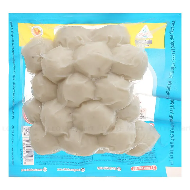 Thành phần: Thịt cá basa 60%, surimi thịt cá lạc 35%, tinh bột khoai tây, đạm đậu nành, tinh bột bắp biến tính , bột lòng trắng trứng, gelatin , hành tím, tỏi, muối, đường, bột nêm, chất điều vị (E621), chất bảo quản (E200, E202), chất nhũ hóa (E450i, E451i, E452i).