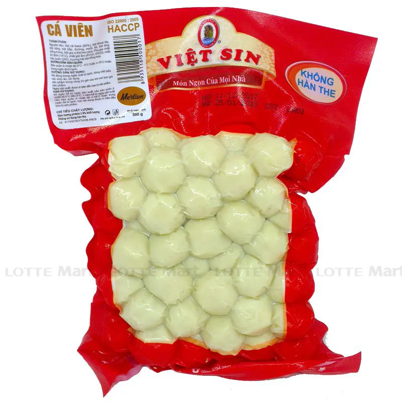 Cá viên Việt Sin 500g với thành phần nguyên liệu được làm từ cá basa tươi và được sản xuất theo dây chuyền tiên tiến, đảm bảo vệ sinh an toàn thực phẩm.