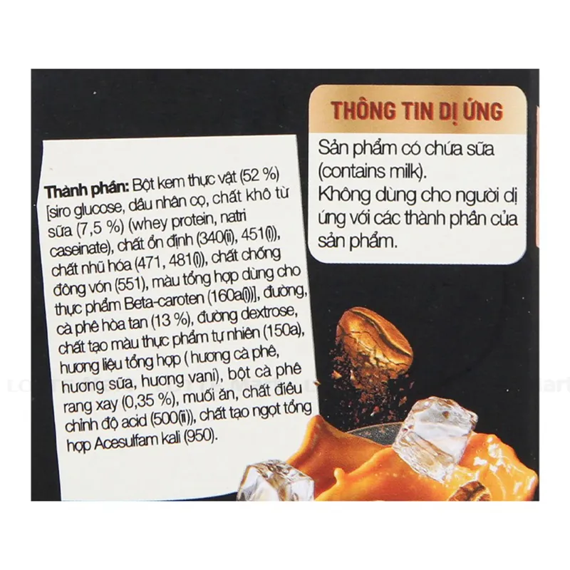 - Bột kem sữa (27%), đường dextrose, đường, cà phê hòa tan (10.5%), bột kem, bột cà phê rang xay (1.5%), chất tạo màu thực phẩm tự nhiên Caramen nhóm I, muối ăn, chất làm dày, chất điều chỉnh độ acid, chất tạo hương tổng hợp dùng trong thực phẩm (hương cà phê, chất tạo ngọt tổng hợp Acesulfam kali.