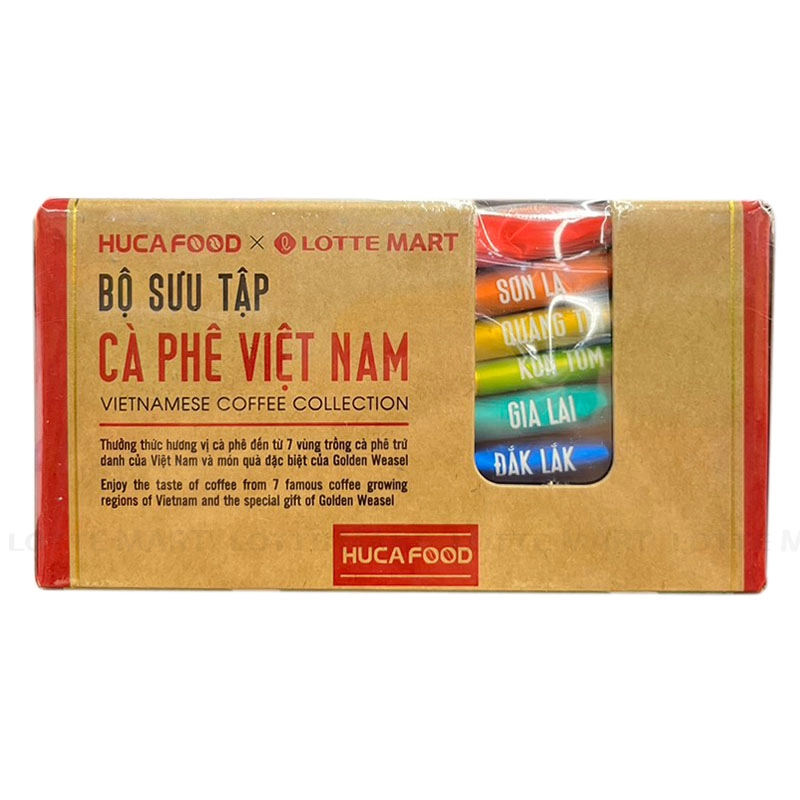 Cà Phê Túi Lọc Con Chồn Vàng Vietnam Specialty là sản phẩm được kết hợp giữa Huca Food và LOTTE MART, là một tuyển tập độc đáo gồm 8 gói cà phê túi lọc, trong đó có 7 gói được chọn lọc từ 7 vùng trồng cà phê đặc trưng trên khắp Việt Nam gồm như Sơn La, Quảng Trị, Kon Tum,...