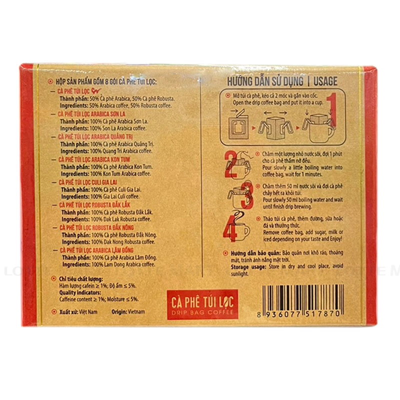Hộp sản phẩm gồm 8 gói cà phê túi lọc: