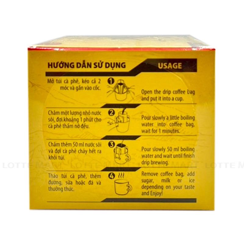 Hướng dẫn sử dụng: Mở túi cà phê, kéo cả 2 móc và gắn vào cốc. Châm một lượng nước sôi nhỏ, đợi khoảng 1 phút cho cà phê nở đều rồi châm thêm 50ml nước sôi và đợi cà phê chảy hết ra khỏi túi sau đó tháo túi và thêm đường, sữa, đá.