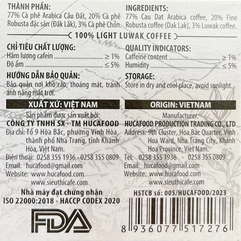Thành phần: 77% cà phê Arabica Cầu Đất, 20% cà phê Robusta đặc sản (Đắk Lắk), 3% cà phê chồn.