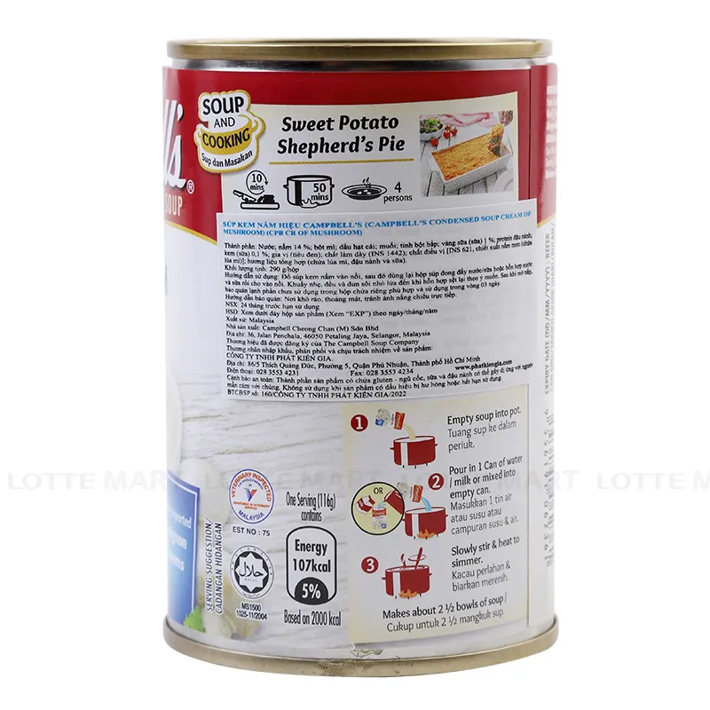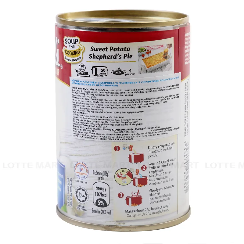 - Súp Kem Nấm Campbell's Hộp 290G là một trong những món khai vị đặc trưng của nền ẩm thực Châu Âu. Một bát Súp Kem Nấm Campbell's thơm lừng, ăn kèm theo chút bánh mì được nướng giòn thì còn gì tuyệt vời hơn, hoặc được dùng làm nguyên liệu cơ bản trong các món hầm, ...