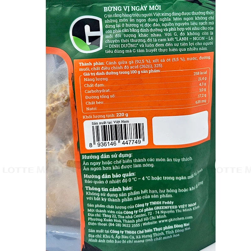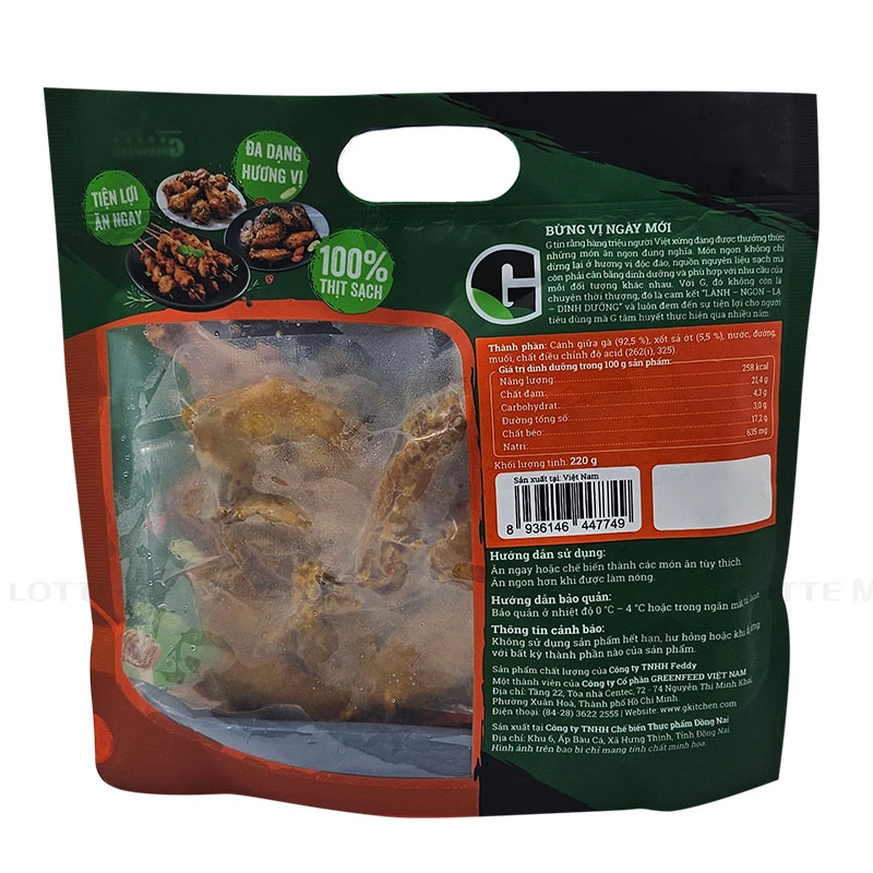 - Sản phẩm được chế biến sẵn, đóng gói tiện dụng, có thể ăn ngay hoặc ngon hơn khi làm nóng bằng lò vi sóng từ 1 phút. Cánh Giữa Gà Vị Sả Ớt G Kitchen luôn là lựa chọn tiện lợi và chất lượng dù là trong bữa ăn gia đình, trong lúc bận rộn hay khi muốn có món mặn thơm ngon nhanh chóng.