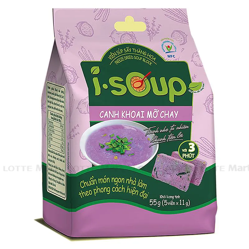 - Canh Khoai Mỡ Chay Ăn Liền I-Soup NFC Gói 5 Viên 11G là sản phẩm ở dạng viên nén nhỏ gọn tiện lợi. Sản phẩm thuộc thương hiệu I-SOUP, là một trong những thương hiệu nổi bật trên thị trường Việt Nam với các sản phẩm canh ăn liền chất lượng và ngon miệng.