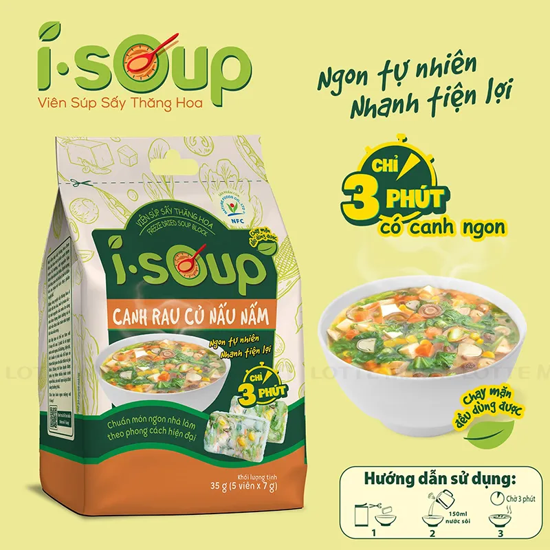 - Sản phẩm gồm 05 viên thơm ngon hấp dẫn, dạng viên nén nhỏ gọn tiện lợi. I-SOUP cho bạn tô canh ngon lành dinh dưỡng chuẩn món ngon nhà làm chỉ sau 3 phút, cho gia đình bạn bữa ăn ngon đặc biệt phù hợp cho những ngày bận rộn.