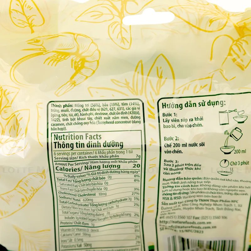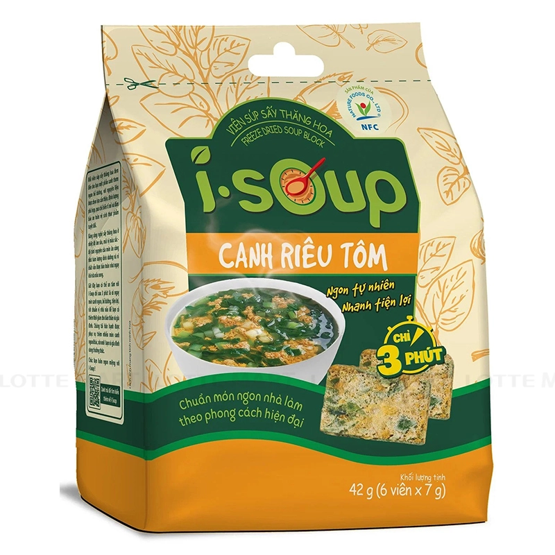 - Canh Ăn Liền Riêu Tôm I-Soup NFC Gói 6 Viên 7G chứa các nguyên liệu nấu canh thông gồm Mồng tơi, bầu, tôm, trứng, muối, đường,... sử dụng công nghệ sấy thăng hoa và sấy nhiệt Nhật Bản, giúp giữ lại tối đa hàm lượng chất dinh dưỡng nhằm bảo quản được lâu hơn và đảm bảo tốt cho sức khỏe.
