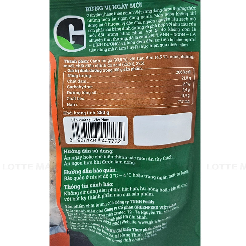 - Cánh Tỏi Gà Tiêu Đen G Kitchen được đóng gói tiện lợi cho việc bảo quản và sử dụng, là lựa chọn lý tưởng cho những ai yêu thích món gà đậm đà, thơm cay vừa phải và phong cách ẩm thực Hàn Quốc tiện lợi, nhanh chóng.