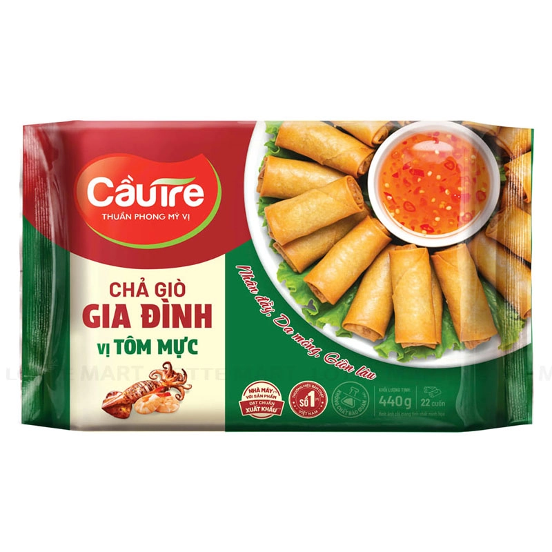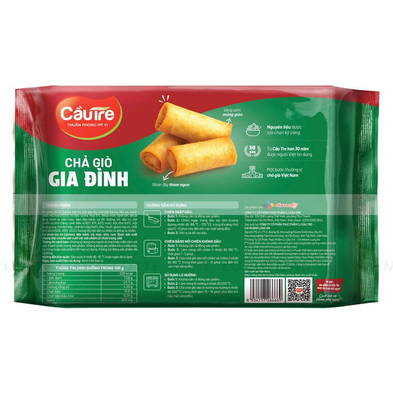 - Chả Giò Gia Đình Cầu Tre Vị Tôm Mực nổi bật với lớp vỏ giòn tan, khi chiên lên sẽ có độ vàng rộm hấp dẫn, giữ được độ giòn và hương thơm lan tỏa.