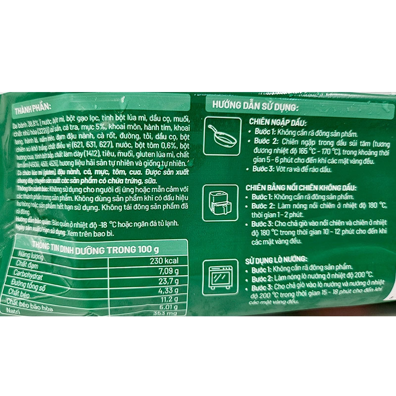 - Nhân tôm mực béo bùi chuẩn vị kết hợp cùng các loại rau củ như khoai môn, củ sắn và gia vị truyền thống, mang đến độ ngọt tự nhiên, cân bằng hương vị và giàu dinh dưỡng. Mỗi chiếc chả giò là sự hòa quyện tinh tế giữa vị ngọt của hải sản, vị bùi của rau củ và hương thơm đặc trưng của hành tiêu.