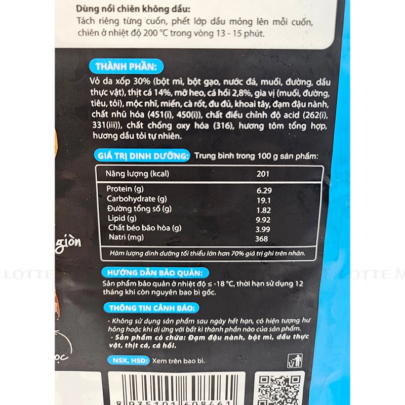 - Vỏ da xốp 30% (bột mì, bột gạo, nước đá, muối, đường, dầu thực vật), thịt cá 14%, mỡ heo, cá hồi 2.8%, gia vị (muối, đường, tiêu, tỏi), mộc nhĩ, miến, cà rốt, đu đủ, khoai tây, đạm đậu nành, chất nhũ hóa (451(i), 450(i)), chất điều chỉnh độ acid (262(i), 331(iii)), chất chống oxy hóa (316), hương tôm tổng hợp, hương dầu tỏi tự nhiên.
