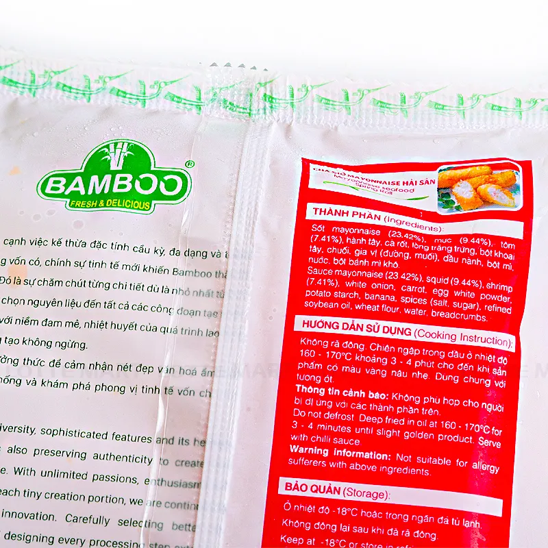 Chả Giò Hải Sản Mayonnaise Bamboo của thương hiệu BamBoo được sản xuất trên quy trình công nghệ hiện đại, khép kín, đảm bảo an toàn cho người tiêu dùng. Sản phẩm sử dụng nguồn nguyên liệu tự nhiên, không sử dụng chất bảo quản độc hại, đạt tiêu chuẩn vệ sinh an toàn thực phẩm.