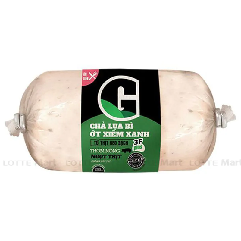 Sản phẩm đạt chứng nhận ISO 22000:2018, GMP, HACCP. Thành phần: Thịt heo (60%), da heo (20%), tai heo, nước, ớt xiêm xanh (2%), đường, nước mắm, chất ổn định (E1412, E407), muối i-ốt, chất điều vị (E621), tiêu, bột whey giảm lactose, chất điều chỉnh độ acid (E262i, E325, E326), chất giữ ẩm (E450i, E451i, E452i), chất chống oxy hóa (E316).
