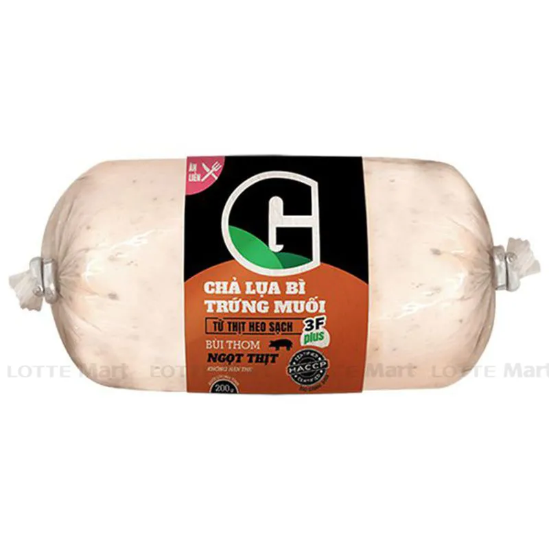 Sản phẩm đạt chứng nhận ISO 22000:2018 , GMP, HACCP. Thành phần: Thịt heo (60%), da heo (20%), lòng đỏ trứng muối (8%), tai heo, nước, đường, nước mắm, chất ổn định (E1412, E407), muối i-ốt, chất điều vị (E621), tiêu, bột whey giảm lactose, chất điều chỉnh độ acid (E262i, E325, E326), chất giữ ẩm (E450i, E451i, E452i), chất chống oxy hóa (E316).