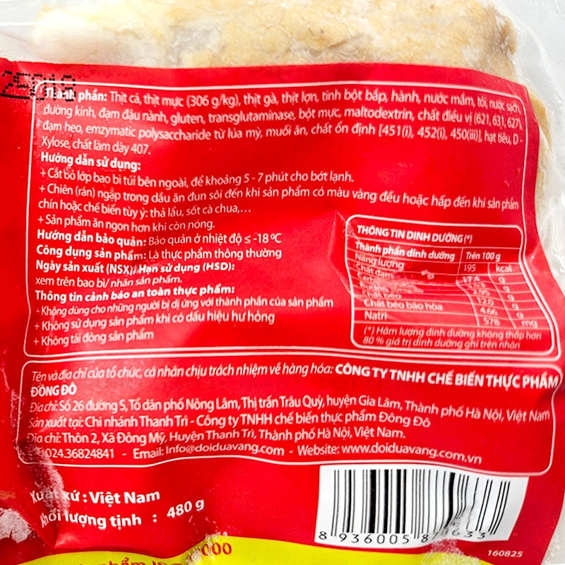 - Thịt cá, thịt mực (306 g/kg), thịt gà, thịt lợn, tinh bột bắp, hành, nước mắm, tỏi, nước sốt đường kính, đạm đậu nành, gluten, transglutaminase, bột mực, maltodextrin, chất điều vị (621, 631, 627), đạm heo, enzymatic polysaccharide từ lúa mì, muối ăn, chất ổn định (451(i), 452(i), 450(iii)), hạt tiêu, D-xylose, chất làm dày 407.