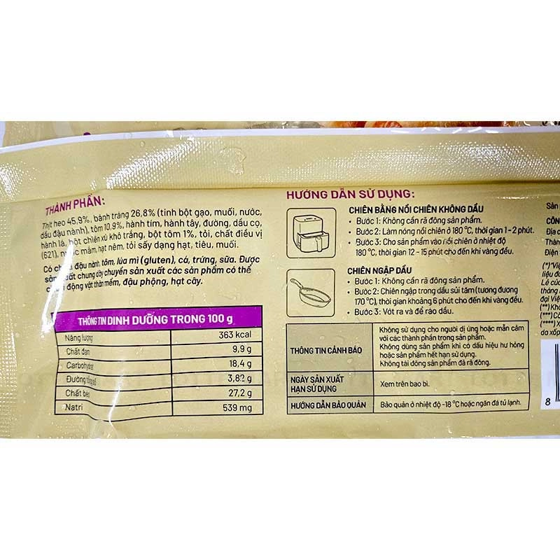 - Thịt heo 45.9%, bánh tráng 26.8% (tinh bột gạo, muối, nước, dầu đậu nành), tôm 10.9%, hành tím, hành tây, đường, dầu cọ, hành lá, bột chiên xù khô trắng, bột tôm !%, tỏi, chất điều vị (621), nước mắm, hạt nêm, tỏi sấy dạng hạt, tiêu, muối.
