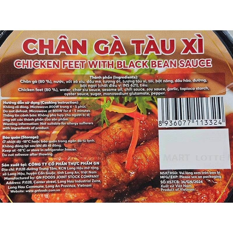 - Chân gà 80%, nước, xốt xá xíu, dầu mè, tương ớt, tương tàu xì 1.8%, tỏi, bột năng, dầu hào, đường, chất điều vị (INS 621), tiêu.