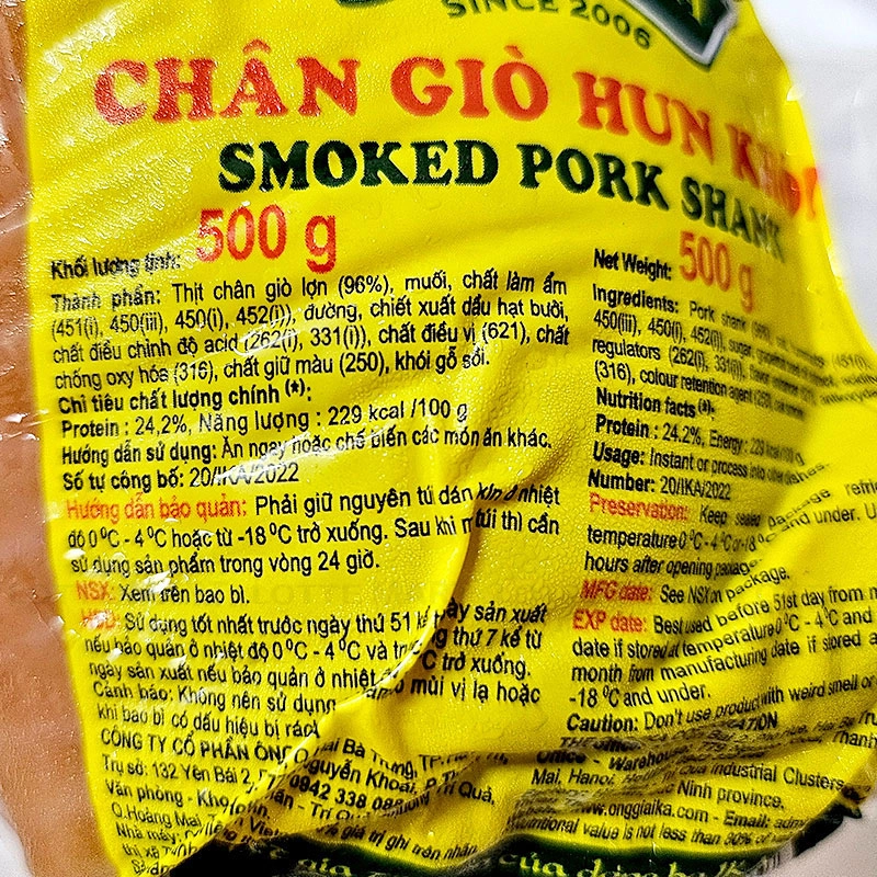 - Chân Giò Hun Khói Ông Già IKA là sản phẩm được chế biến từ công thức gia truyền độc đáo của dòng họ IKA, mang đến món ăn thơm ngon đậm đà, giữ trọn giá trị dinh dưỡng trong từng lát thịt. Thịt được tuyển chọn kỹ lưỡng, kết hợp cùng quy trình hun khói bằng gỗ sồi tự nhiên, tạo nên hương thơm đặc trưng và vị ngon khó quên.