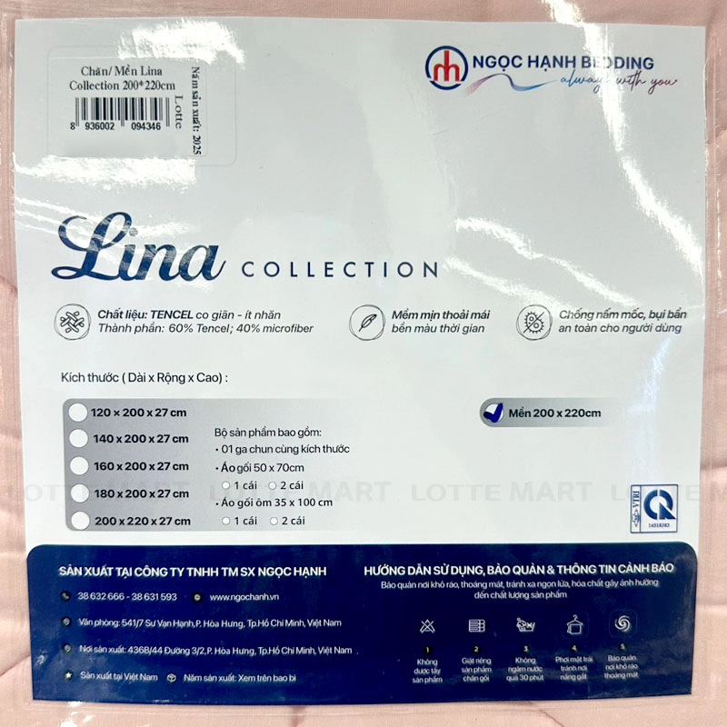 - Chăn Lina Ngọc Hạnh 2mx2.2m thuộc dòng Lina Collection, được thiết kế phù hợp cho nhu cầu sử dụng hàng ngày trong gia đình. Sản phẩm có kích thước phù hợp cho giường đôi và không gian nghỉ ngơi rộng rãi.