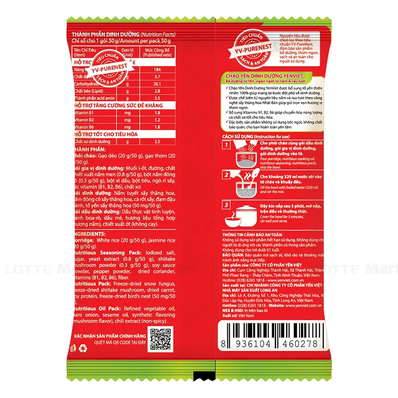 Hướng dẫn sử dụng: Cho cháo cùng gói dầu, gói gia vị, gói yến và rau vào tô. Cho khoảng 320 ml nước sôi vào tô cháo và quậy đều. Đậy kín nắp sau 3 phút, mở nắp, trộn đều và thưởng thức. Hướng dẫn bảo quản: Bảo quản ở nhiệt độ 2-8 độ C.