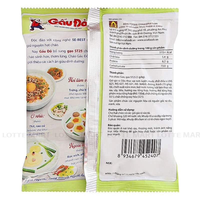 Cháo Thịt Bằm Gấu Đỏ Gói 50G được tạo nên từ những hạt gạo trắng, thơm, kết hợp công nghệ chế biến SE - BEST – nổi bật chỉ có ở Gấu Đỏ giữ trọn vẹn dưỡng chất trong gạo, sẽ mang đến cho bạn món cháo thơm ngon, hấp dẫn với những hạt cháo bung đều, mềm mại nhưng vẫn giữ được trọn vẹn tinh chất của từng hạt gạo.