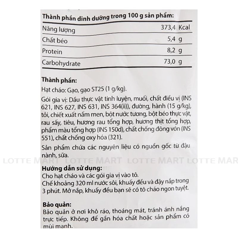Hướng dẫn sử dụng: Cho hạt cháo và các gói gia vị vào tô. Chế khoảng 350ml nước sôi, khuấy đều và đậy nắp trong 3 phút. Mở nắp, khuấy đều bạn sẽ có tô cháo ngon tuyệt. Hướng dẫn bảo quản: Bảo quản nơi khô ráo, thoáng mát, tránh ánh nắng trực tiếp.