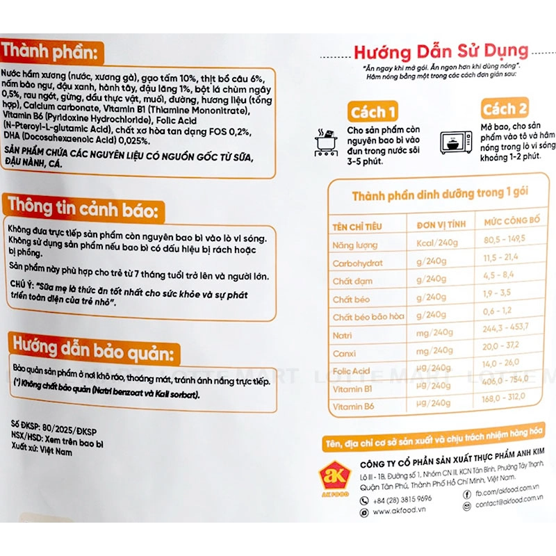 - Nước hầm xương (nước, xương gà), gạo tấm 10%, thịt bồ câu 6%, nấm bào ngư, đậu xanh, hành tây, đậu lăng 1%, bột lá chùm ngây 0,5%, rau ngót, gừng, dầu thực vật, muối, đường, hương liệu (tổng hợp), Calcium carbonate, Vitamin B1 (Thiamine Mononitrate), Vitamin B6 (Pyridoxine Hydrochloride), Folic Acid (N-Pteroyl-L-glutamic Acid), chất xơ hòa tan dạng FOS 0,2%, DHA (Docosahexaenoic Acid) 0,025%.