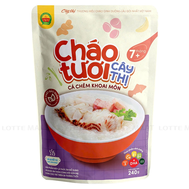 Cháo Tươi Cây Thị Cá Chẽm Khoai Môn là sản phẩm cháo được chế biến sẵn với bí quyết từ nước hầm xương, khá tiện lợi nhưng vẫn dinh dưỡng.