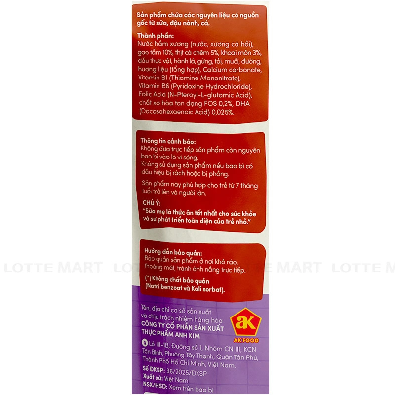- Nước hầm xương (nước, xương cá hội), gạo tâm 10%, thịt cá chẽm 5%, khoai môn 3%, dầu thực vật, hành lá, gừng, tỏi, muối, đường, hương liệu (tổng hợp), Calcium carbonate, Vitamin B1 (Thiamine Mononitrate), Vitamin B6 (Pyridoxine Hydrochloride), Folic Acid (N- Pteroyl-L-glutamic Acid), chất xơ hòa tan dạng FOS 0,2%, DHA (Docosahexaenoic Acid) 0,025%.