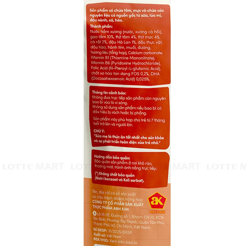 - Nước hầm xương (nước, xương cá hồi), gạo tấm 10%, thịt tôm 4%, thịt mực 4%, cà rốt 2%, đậu Hà Lan 1%, dầu thực vật, dầu hào, hành tím, muối, đường, hương liệu (tổng hợp), Calcium carbonate, Vitamin B1 (Thiamine Mononitrate), Vitamin B6 (Pyridoxine Hydrochloride), Folic Acid (N-Pteroyl-L-glutamic Acid), chất xơ hòa tan dạng FOS 0,2%, DHA (Docosahexaenoic Acid) 0,025%.
