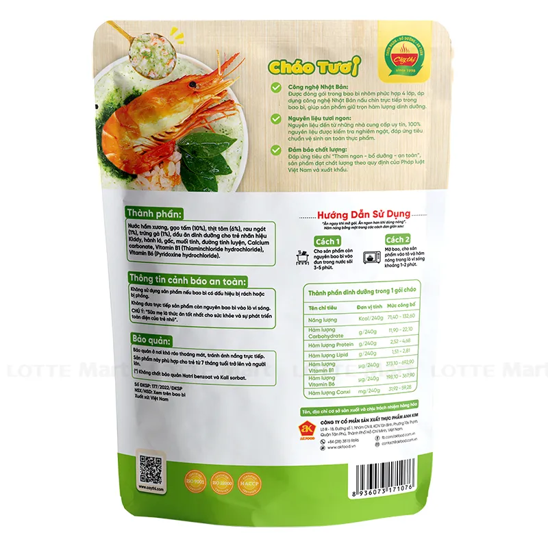 Thành phần: Nước xương hầm, gạo tấm (10%), thịt tôm (5%), rau ngót (1%), trứng gà (0,5%), xốt canxi vỏ trứng (0,3%), dầu đậu nành, muối, đường, hạt nêm, chất điều vị (621), vitamin nhóm B (B1, B6)