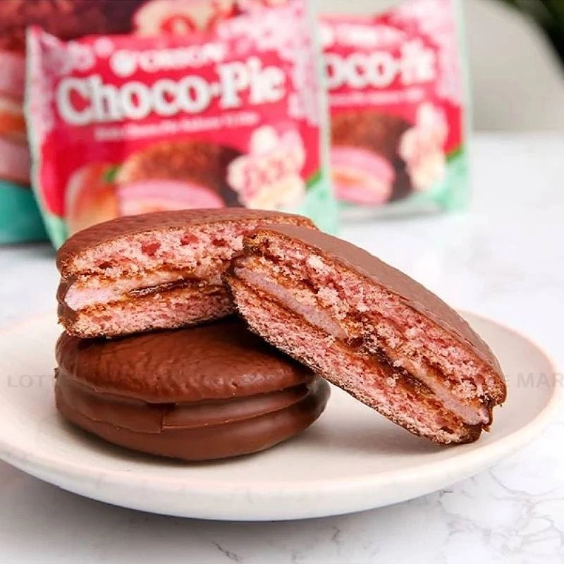 - Bánh ChocoPie Sakura Vị Đào là món ăn vặt khá được ua chuộng với lớp vỏ bánh socola thơm lừng, mềm mại, mịn màng được phủ bên ngoài với vị ngọt dịu, không bị đắng cùng lớp nhân marshmallow vị đào dai dẻo beo béo, tan trog miệng.