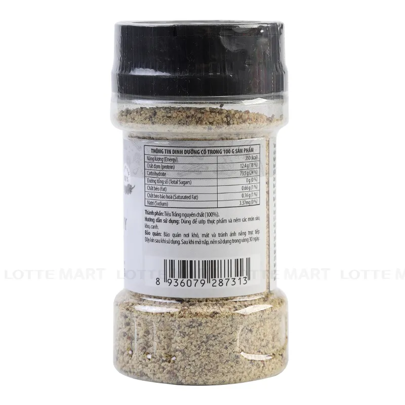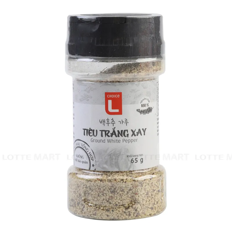 - Tiêu Trắng Xay Choice L Hũ 65G sẽ có vị cay vừa phải, không quá nồng, phù hợp cho nhiều người sử dụng. Tiêu có thể dùng để nêm, ướp cho thịt, hải sản,… hoặc là những món đã chín, cho món ăn thêm hấp dẫn, đẹp mắt.