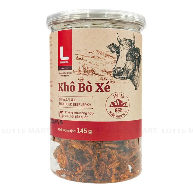 - Khô Bò Xé Choice L được sản xuất bằng 100% thịt bò nhập khẩu từ Úc, tẩm gia vị, sấy khô giúp giữ hương vị bò tự nhiên, giòn rụm và vừa ăn. Khi đưa lên miệng, thực khách sẽ cảm nhận được vị cay của ớt, vị mặn của muối hòa quyện cùng vị ngọt sẵn có trong từng thớ thịt bò tan nơi đầu lưỡi.