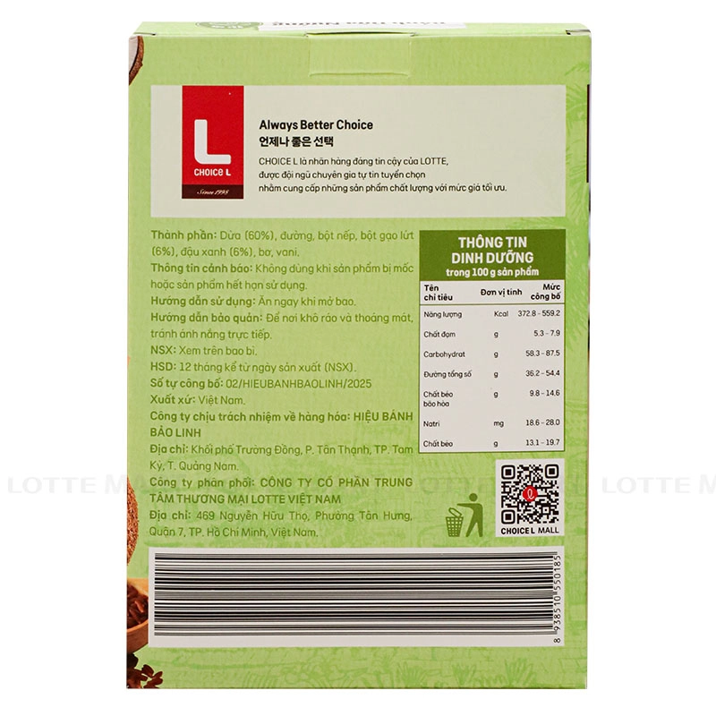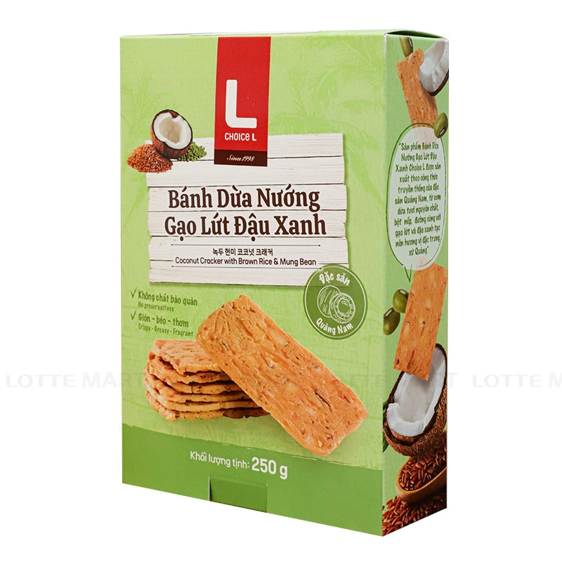 - Bánh Dừa Nướng Gạo Lứt Đậu Xanh Choice L Gói 250g mang hương vị quen thuộc, thơm mùi dừa và đậu xanh tự nhiên, giòn rụm, béo ngậy là món ăn vặt gắn với tuổi thơ của rất nhiều người. Hơn nữa, dừa cung cấp nhiều dưỡng chất tốt cho cơ thể như đạm, chất xơ, chất béo, canxi, magie... cùng các vitamin B1, B2, B3, B5, B6, B9 và C giúp tim khoẻ mạnh, cải thiện chức năng não bộ, tăng cường hệ miễn dịch và cải thiện chức năng hệ tiêu hoá.